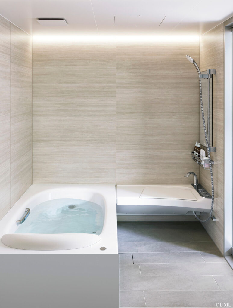 過度な装飾を避け、滑らかなラインの浴槽や洗面ボウルを選ぶと、落ち着きと上質感がアップ。 -