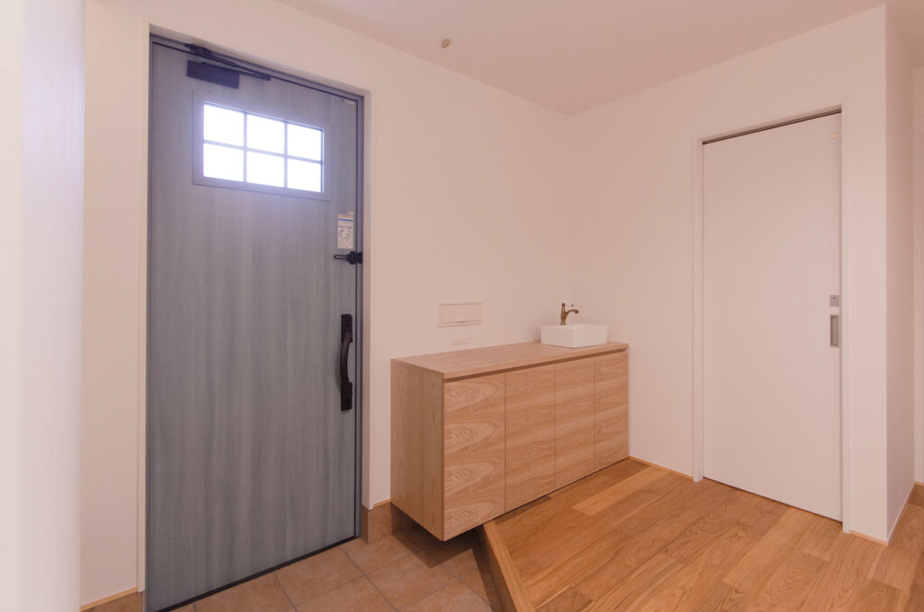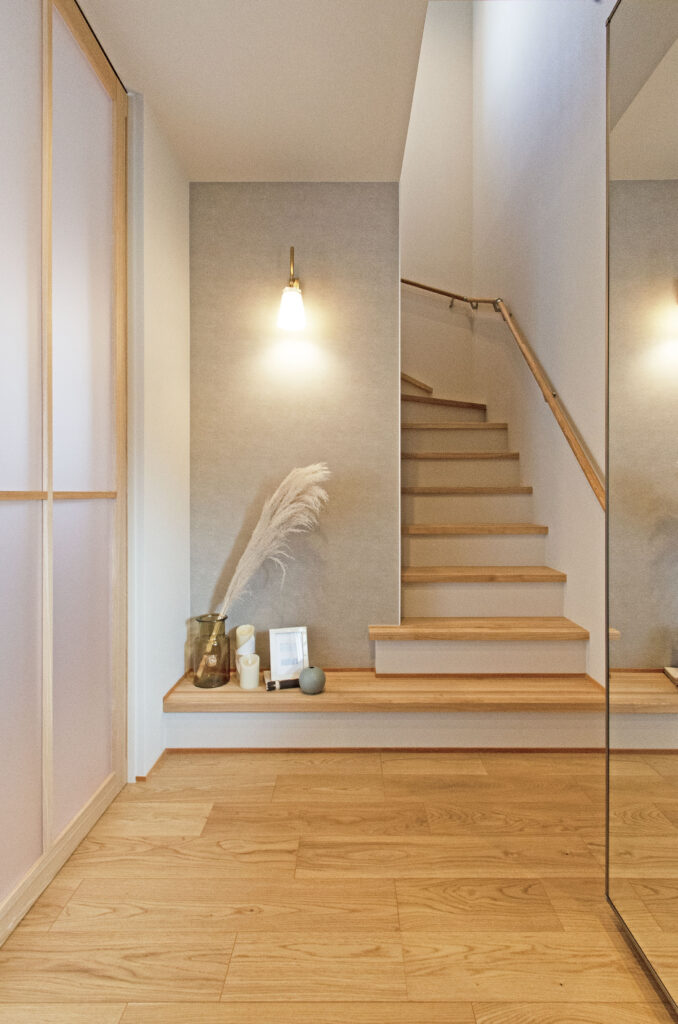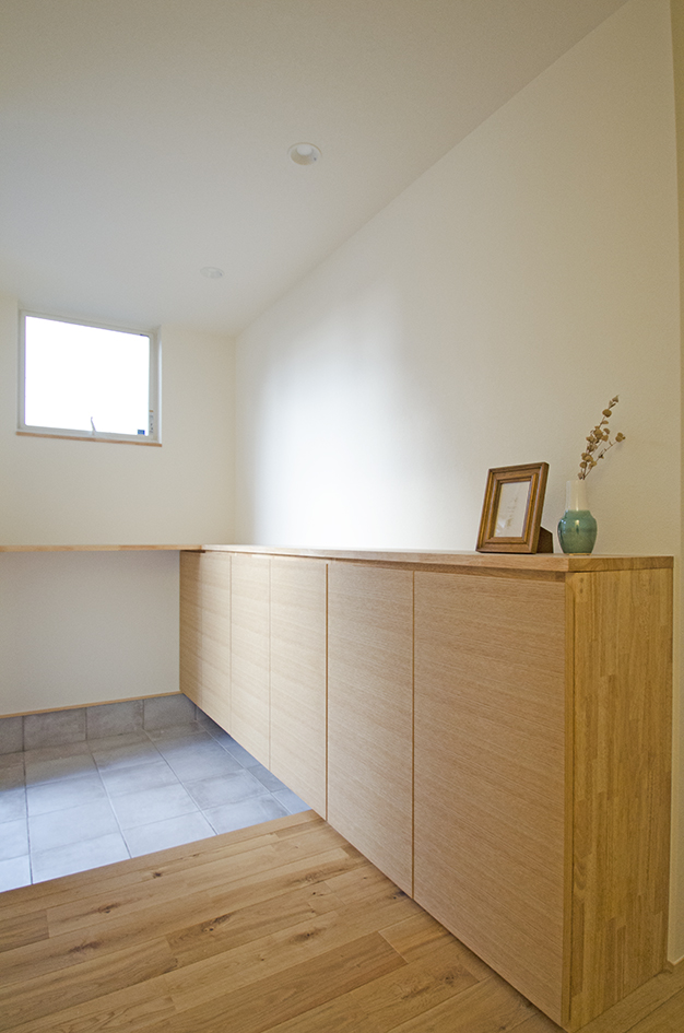 床や造作収納にオークやメープルなどの明るい木材を取り入れると、玄関全体がやわらかな雰囲気になります。