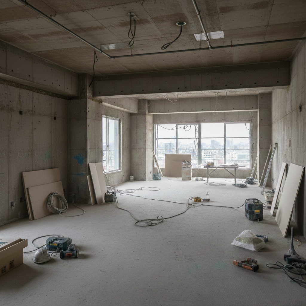 スケルトンリノベーションとは、壁・床・天井の下地・設備などをすべて撤去し、建物の構造体(骨組み)の状態まで戻してから新しくつくり直すリノベーションのことです。