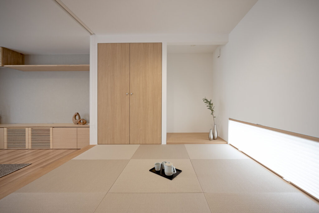 ジャパンディスタイルでは、「主張しすぎない素材使い」が重要。畳も空間の一部として自然に溶け込みます。