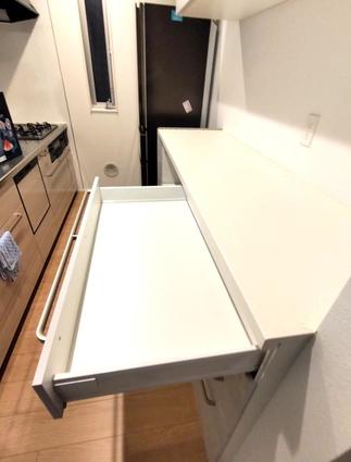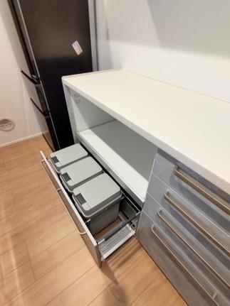 賢い家電収納スペース: スライド式の家電収納下は、オープンなスペースとして活用可能。置き場所に困るゴミ箱をスッキリ収めることができるので、キッチン周りがいつも整います