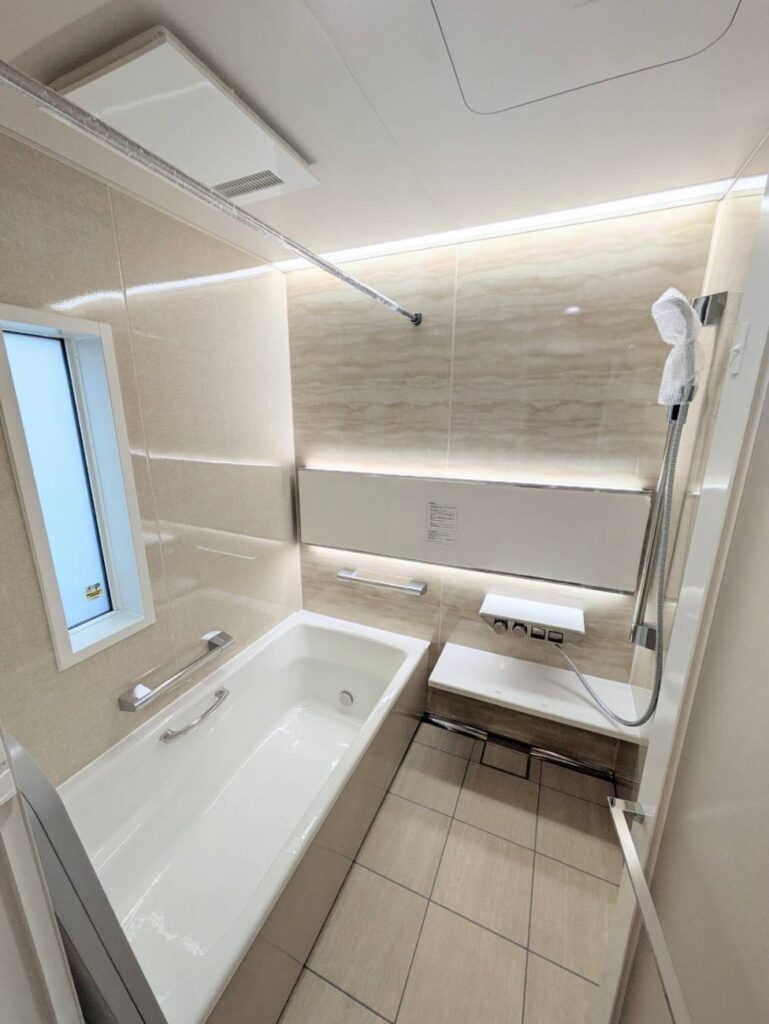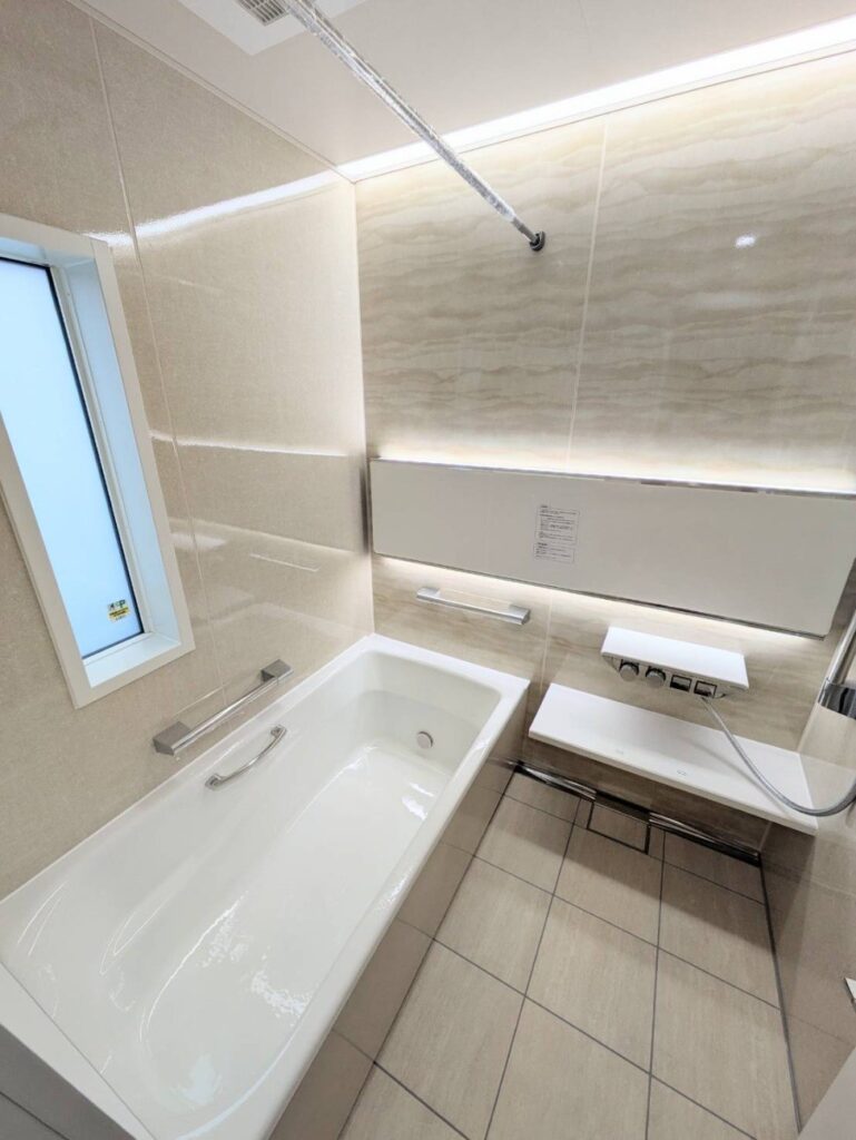 • グレージュとホワイトを基調にした落ち着きのある空間。 間接照明がホーロー壁面にやわらかく反射し、光沢感のある上品な印象に仕上がりました。 浴槽には重厚感と保温性に優れた鋳物ホーロー浴槽を採用。湯あたりがやわらかく、心まで温まる入浴時間を叶えます。