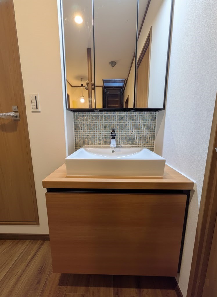 • 洗面空間には、デザイン性と機能性を兼ね備えたLIXIL「ルミシス」を採用しました。 ベッセルタイプの洗面ボウルが空間に上質な印象を与え、まるでホテルのような洗面空間を演出します。収納力も確保しながら、すっきりとした見た目を実現しました。